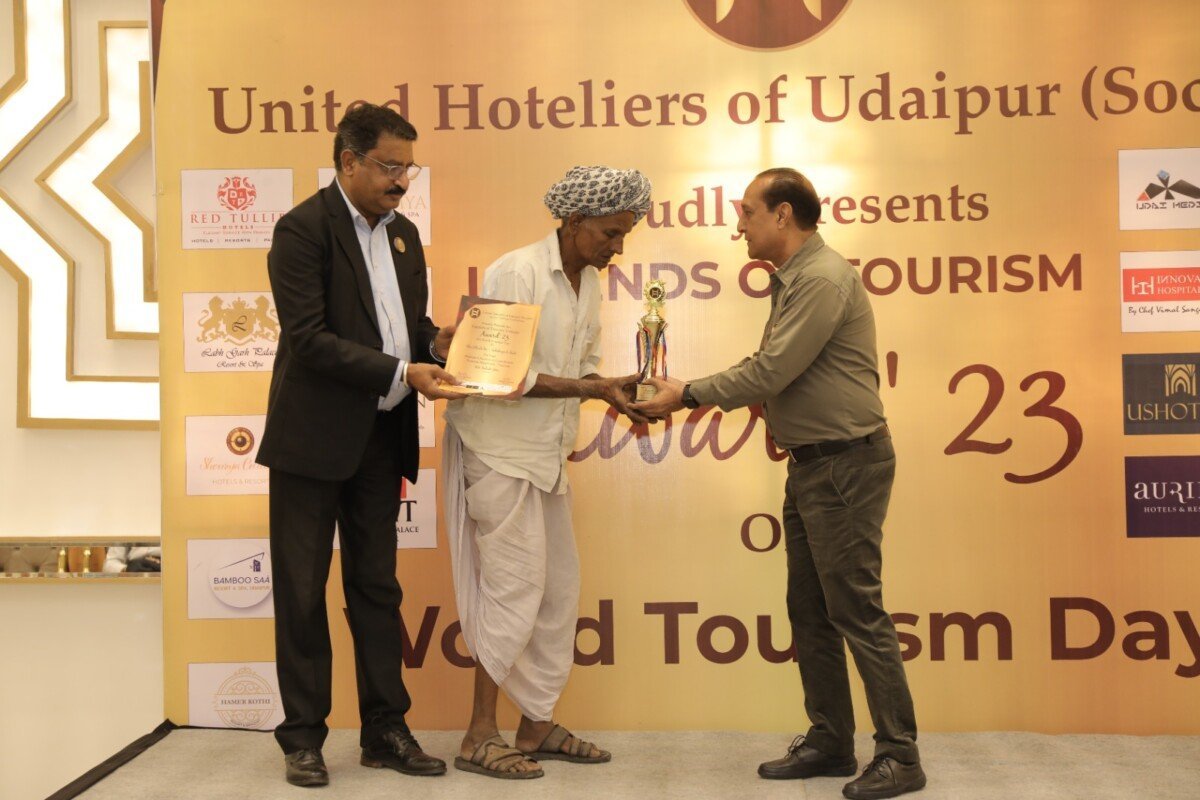 In observance of World Tourism Day 2023, under the stewardship of the United Hoteliers of Udaipur Society, the inaugural “Legends of Tourism Awards 2023” ceremony was held at the Raghu Mahal Hotel’s banquet hall. Society President Mr. U.B. Srivastava, Secretary Mr. Rupam Sarkar, Vice President Mr. Devendra Parihar, and Treasurer Mr. Ujjwal Menaria shared that this prestigious event honored distinguished, senior members directly and indirectly associated with the hotel and tourism industry for their unparalleled contributions. The guest of honor, Ms. Shikha Saxena, praised this unprecedented initiative as the first of its kind in Rajasthan, recognizing various categories, including hotels, travel agencies, tourist guides, bus services, promoters of Rajasthani folk arts, taxi services, auto-rickshaw drivers, railway station porters, handicrafts, miniature paintings, restaurants, and more.